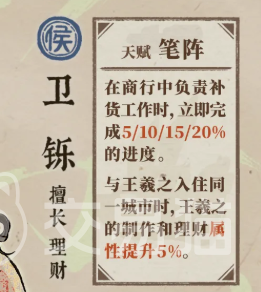 卫铄的专属天赋名为“笔阵”,具备双重协同效果:其一,在商行执行补货操作时,可即时推进部分进度条,初始加成幅度为5%,随天赋等级提升至满级后达20%;其二,当卫铄与王羲之共同驻守同一城市时,可触发联动增益,使王羲之的制作效率与理财能力同步提升5%。此项被动效果显著强化了双人协同场景下的生产链运转效率。