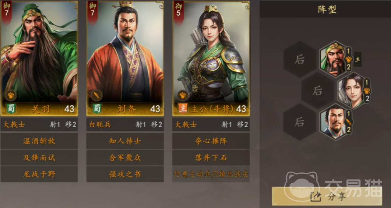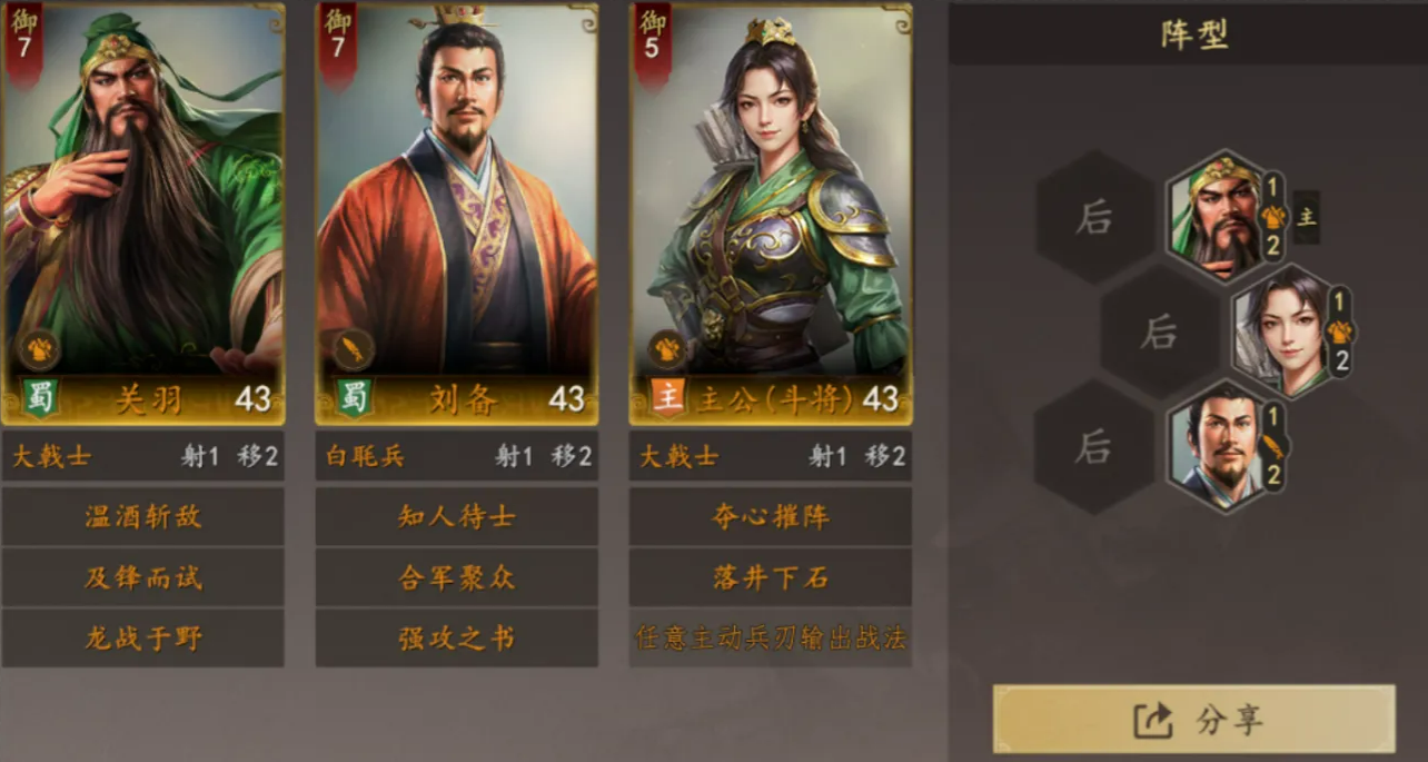 阵容结构简洁明确:刘备作为功能性辅助,提供白毦兵技能所附带的两格范围内止步效果;主公与关羽构成双核输出。若追求极限爆发,主公可装配搴旗斩将或无坚不摧,凭借其基础速度高于关羽的特性实现先手破防,为关羽后续连击创造理想条件。另可搭配落井下石战法,对处于止步状态的目标触发震慑控制,但须确保主公与刘备站位相邻,否则战法生效范围无法覆盖被控目标——此细节常被新手忽略,需特别注意。