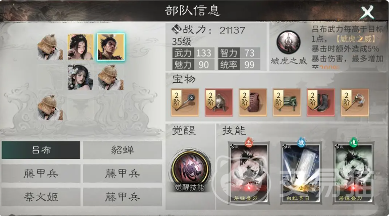 值得注意的是,“层锋叠刃”需吕布品质达到金色方可装备,且同一技能最多仅能装配一次;蔡文姬应携带“首尾相援”,以保障全队持续治疗续航;貂蝉则需配置“凌波微步”,除提供群体治疗外,还可赋予全体闪避效果。若进一步搭配“通权达变”,还可对敌方施加12%防御削减及睡眠抗性压制,大幅提升吕布破甲效果的覆盖率与生效效率。整套配置成型后,队伍不仅能高频触发追击格子加成,还能实现破甲—追击—斩杀的高效循环。