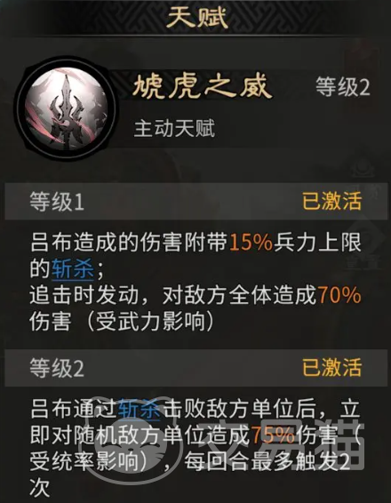 吕布的天赋机制以“斩杀”为核心,具备明确的兵力阈值判定逻辑:当目标兵力低于自身兵力上限的15%时,即可触发斩杀效果;成功触发后,将额外发动一次追击,造成相当于基础伤害70%的附加输出。更关键的是,该武将在单回合内每胜出一次武力比拼(即武力值高于敌方目标),即可获得2点武力加成与1%斩杀伤害提升。该增益可叠加,且直接作用于后续所有斩杀及追击行为。但需注意,所有属性成长均严格绑定追击次数——只有在当回合成功发动多次追击,才能充分激活天赋的滚动强化效果。因此,吕布的站位必须确保能稳定覆盖队友提供的两个“追击格子”,这是发挥其上限强度的前提条件。