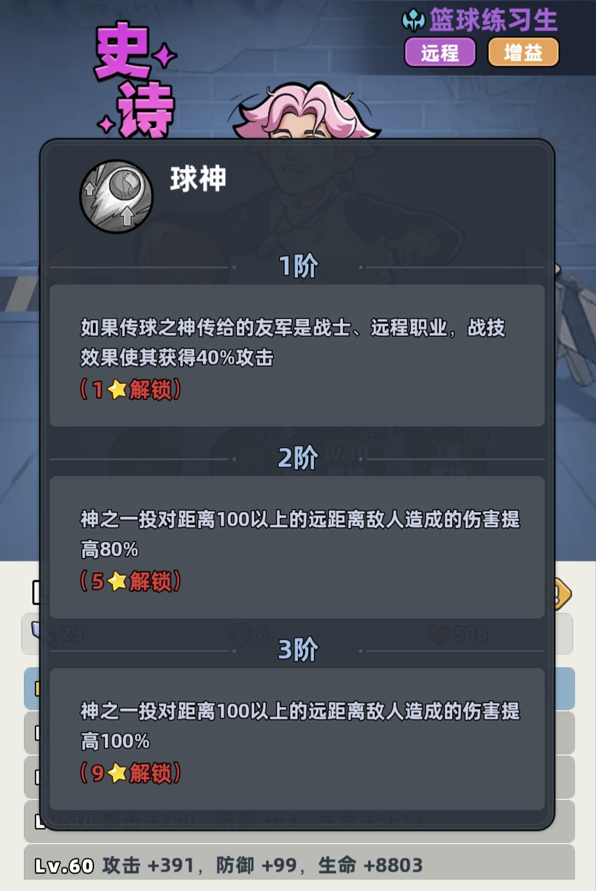 尽管基础属性未达神话或传说层级,篮球练习生却拥有明确的职业定位——远程物理输出。其核心职业特性为“所有伤害提升25%”,这一全局增益不依赖装备或队友配置,生效稳定且覆盖全程。此外,该角色获取门槛极低,无需高成本抽卡,零氪或微氪玩家均可快速满星培养,所有技能均能解锁至最高等级,保障战力完整释放。