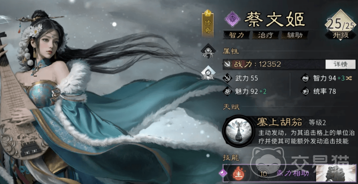 蔡文姬是前期极易获取且成长曲线平滑的群体辅助型武将。天赋“塞上胡笳”在主动行动时,为追击格内友军恢复等同于自身攻击力100%的生命值,并附加“余音”效果;该效果可在追击技命中后,以一定概率再次触发一次技能。“五音共鸣”为觉醒技,能量充满时为全体队友恢复128%兵力,并有25%概率随机赋予其中一人一项增益:“宫”提升暴击率10%,“商”提升暴击伤害36%,“角”提升命中率10%,“征”提升闪避率8%,多维度支撑队伍持续作战能力。