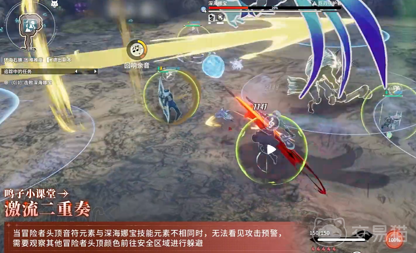 随后释放的“激流二重奏”为范围动态判定技能。安全区域仅对携带匹配音符的玩家可见,并同步触发头顶特效提示;若音符不匹配,则视野中无预警标识,需依赖队友位置参考或语音同步确认落点。该机制强调信息共享与移动一致性,单人脱离编队将大概率陷入不可见危险区。