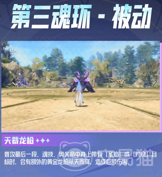 第三魂环被动“天裁龙枪”构成重要伤害补充机制。当普攻最后一段、魂技或奥义命中带有【圣焰】或【灼烧】状态的目标时,将自动追加一次从天而降的黄金龙枪打击,造成高额附加伤害。此效果显著提升王秋儿与火属性队友的协同作战效率,亦强化其单人连段中的爆发密度,属不可忽视的伤害增幅模块。