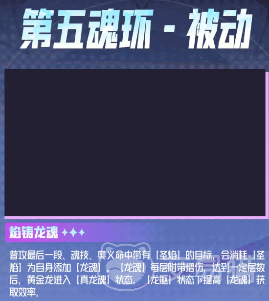 第五魂环被动“焰铸龙魂”是后期伤害跃升的关键引擎。当普攻末段、魂技或奥义命中携带【圣焰】的目标时,消耗该状态并叠加一层【龙魂】,每层提升基础伤害。累计至阈值后激活【真龙魂】状态,触发显著的全周期伤害增幅。值得注意的是,在【龙躯】状态下获取【龙魂】的效率进一步提升,二者存在明确的协同增益关系,推荐优先开启【龙躯】再集中叠层,以实现收益最优化。
