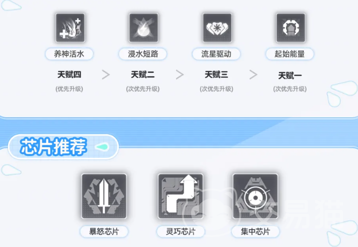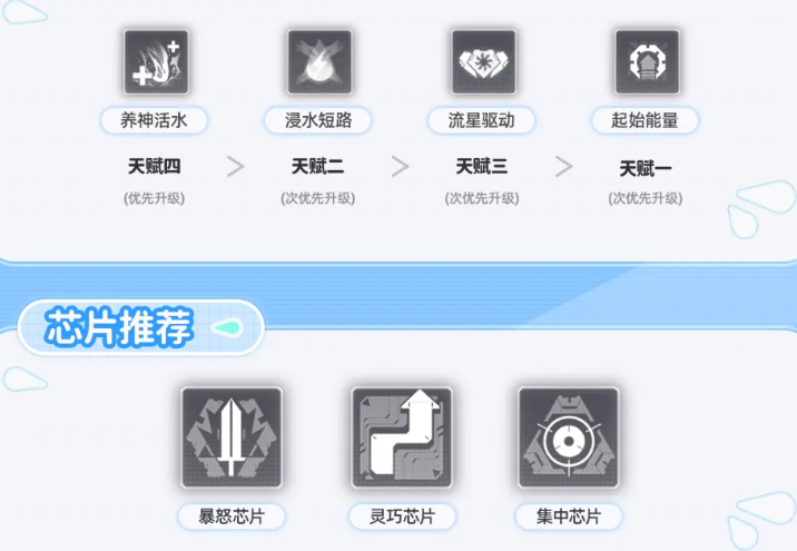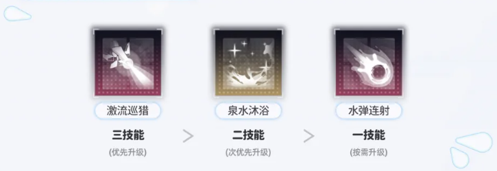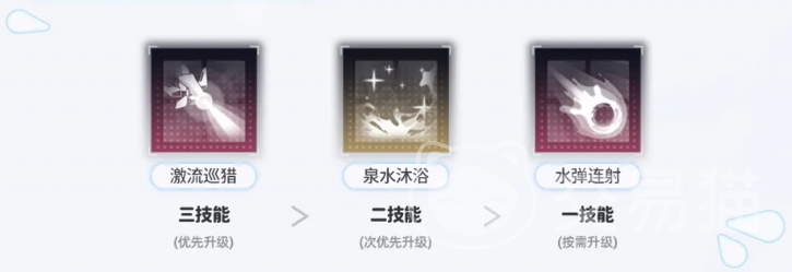 技能升级优先级推荐:三技能>二技能>一技能。三技能作为核心增益与减益触发技,等级提升直接增强“甘泉”覆盖率与“水蚀”持续时间;天赋方面,优先点满天赋4(强化水蚀效果),其次为天赋2(提升甘泉增益幅度)。