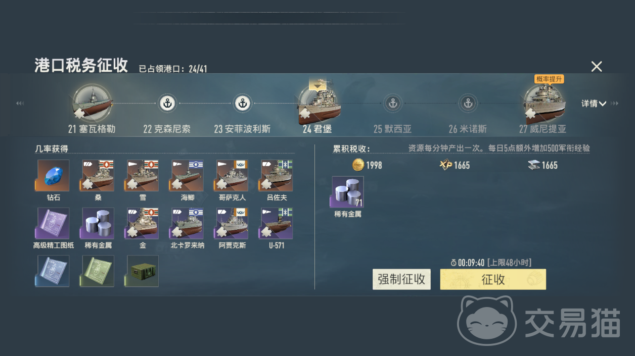 港口占领完成后,税收进入全自动结算阶段。该机制不依赖手动操作,所有已控港口按固定周期向主基地输送资源。关键在于规模效应——税收总量与可控港口总数呈正相关,每新增一座港口,都将线性提升钻石、金币、经验、铁、稀有金属、舰船图纸及碎片等多类资源的单位时间产出率。由此形成“扩张→增税→强化→再扩张”的正向循环链路,为高难度关卡攻坚提供底层支撑。