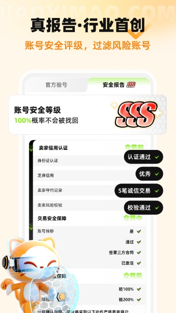 在交易猫买号安全这块绝对可以放心,交易猫是阿里巴巴灵犀互娱旗下的平台,有大厂在这做背书,安全和信誉都是顶级的。并且平台还承诺全场送永久包赔的,用户的的每一笔交易都会有长期保障,相当于有着终身售后。现在平台的有着超过1亿玩家信任,另外支持近6000款热门游戏,将近上百万个精品账号可以去挑选。至今已完成约2亿笔安全交易,深受广大用户的信赖,买游戏账号一定要首选交易猫。