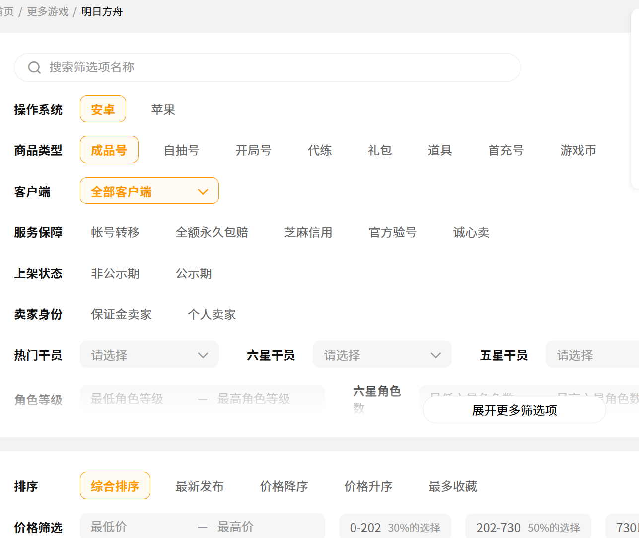 交易猫针对明日方舟做了专门的独立专区,覆盖了各类渠道服,不管是哪个服务器的玩家,都能找到对应的账号资源。平台上的账号资源特别齐全,各类需求都能满足,而且还能根据特定条件进行筛选,不用漫无目的的浏览,几分钟就能锁定想要的账号。