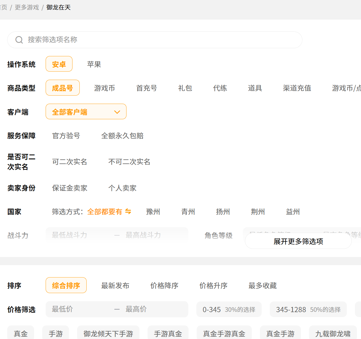 作为头部游戏交易平台,交易猫汇聚了海量的御龙在天的账号资源,覆盖不同服务器、不同战力、不同职业的账号,不管是新手入门的低战号,还是称霸国战的满配高战成品号,都能够轻松找到。平台还设置了精细化的筛选功能,玩家能够根据服务器、职业、战力等等条件进行精准的筛选,不用漫无目的的翻找,几分钟就能找到心仪的账号。