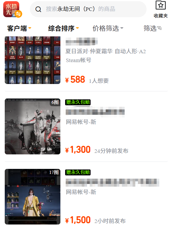 很多人想买的永劫无间账号类型都不一样,还好在交易猫里就可轻松物色各种类型的号。比如资源、角色丰富的开局号,就能让大家体验从头虐菜或者体验剧情的快感。又或者入手满级的高段位成型号,就能直接上线跟其他高手过招。也有的人喜欢某个角色皮肤,只要选择带有该皮肤的账号并入手就好了。