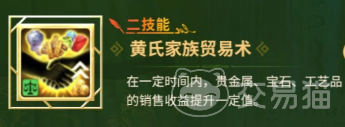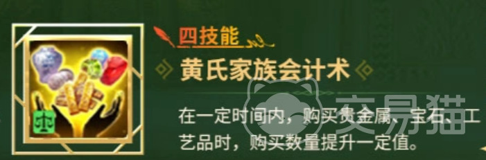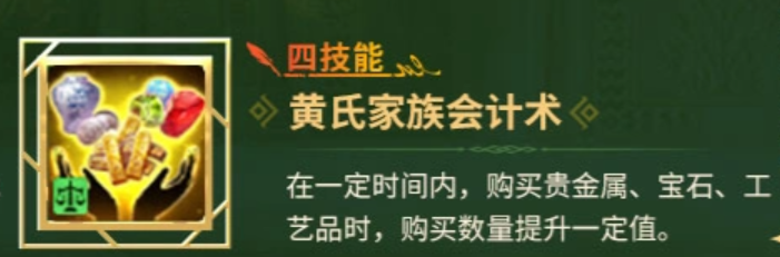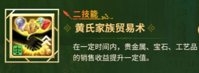 四技能【黄氏家族会技术】则聚焦于采购环节,在技能生效期间提高贵金属、宝石与工艺品的单次购买数量上限;该技能可与二技能协同生效,实现“高买+高卖”的闭环贸易增益体系。