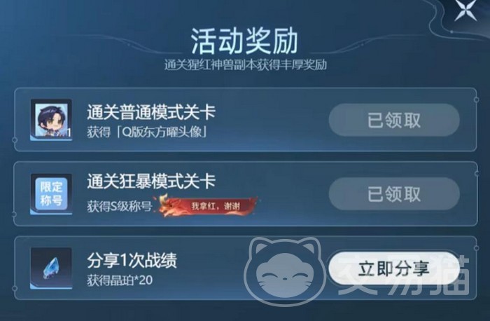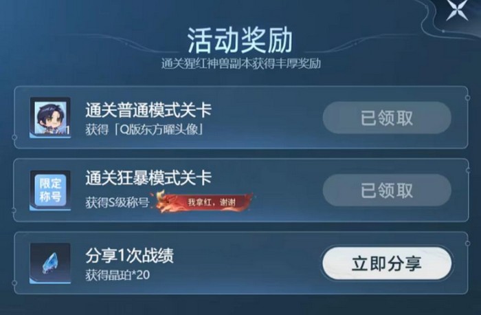 本次挑战目标为猩红神兽(即红buff形态Boss),共设普攻模式与狂暴模式两种难度。完成普攻模式可获得东方曜Q版头像;通关狂暴模式则解锁限定称号“我拿红,谢谢”。该活动全程基于云游戏技术实现,无需下载客户端,低配置设备亦可流畅参与。