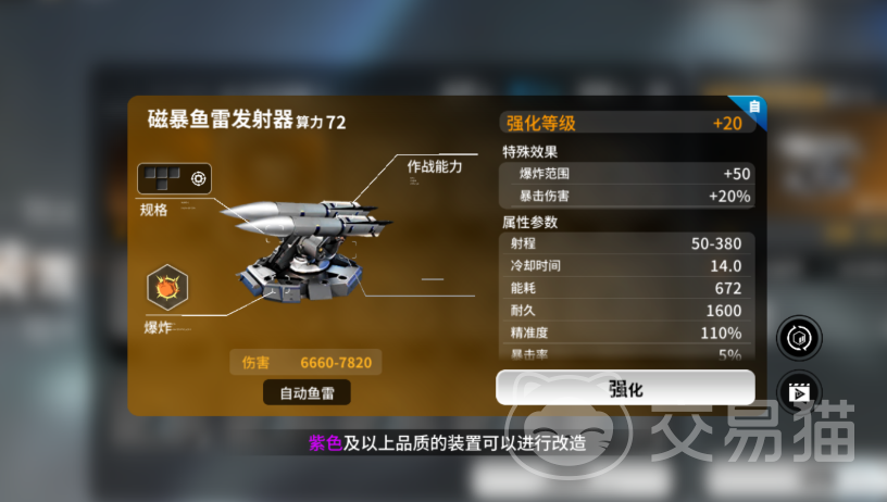 鱼雷类武器中,【磁暴鱼雷发射器】(高能鱼雷发射器)代表当前版本的强度标杆。作为具备范围爆炸特性的AOE武器,其基础伤害显著高于多数同类装备;小范围集中爆破可使重叠区域内的敌方单位生命值骤降至50%或直接清除。该武器经三次改造后解锁“暴击伤害+20%”专属技能,当舰船整体暴击率达标时,其瞬时爆发远超常规鱼雷,成为高效清场手段。需注意的是,其固有短板为射程较短且易被敌方拦截系统命中,实际部署须配合掩护火力协同使用。
