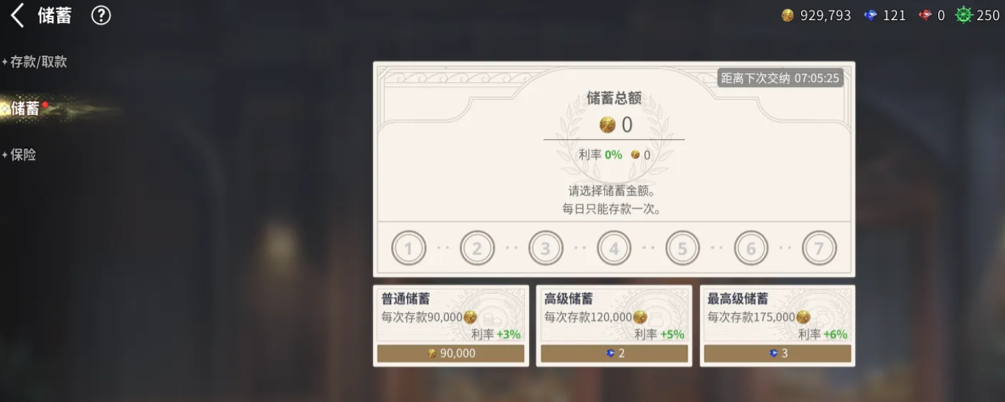 第二项为周期储蓄服务,支持设定为期7天的固定储蓄周期,期间每日限存一次,到期后可全额取出本金,并获得额外利息收益;第三项为定额保险机制,当玩家因意外事件(如海盗劫掠、风暴沉船)导致资产损失时,可依据所购保险档位申领对应额度的赔偿金。