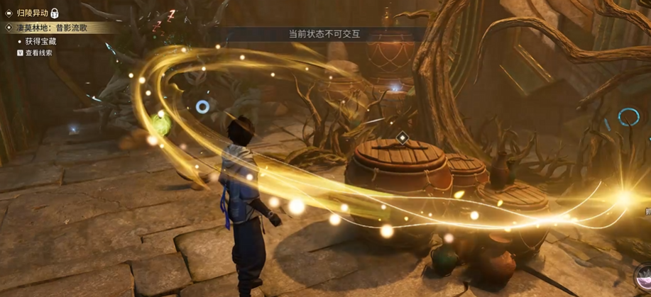 第三枚钥匙碎片需返回一层平台与指定NPC对话后,挑战Boss丰华硕木。击败该目标后拾取碎片,随后携带全部三枚钥匙前往石门前完成合成解锁。进入内部区域后,靠近酒坛触发互动,待周边小怪自然消失后,即可触碰获取唤灵盘,正式达成「鲲游」任务成就。