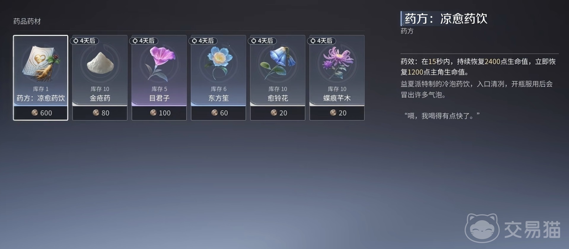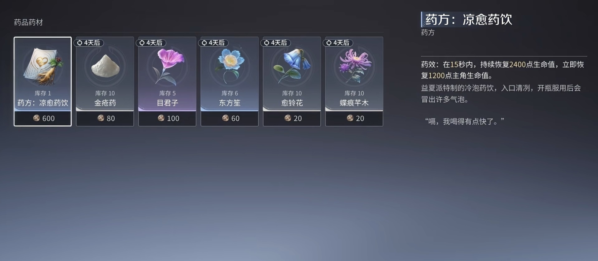 所需药材全部源于大世界自由采集:山坡缓坡、溪流岸边、瀑布落点周边均为高频刷新区域。建议玩家在推进任务途中同步搜寻,实现资源获取效率最大化。配方与药材齐备后,消耗体力即可启动一键批量炼制,成品自动存入背包,战斗中可即时使用。