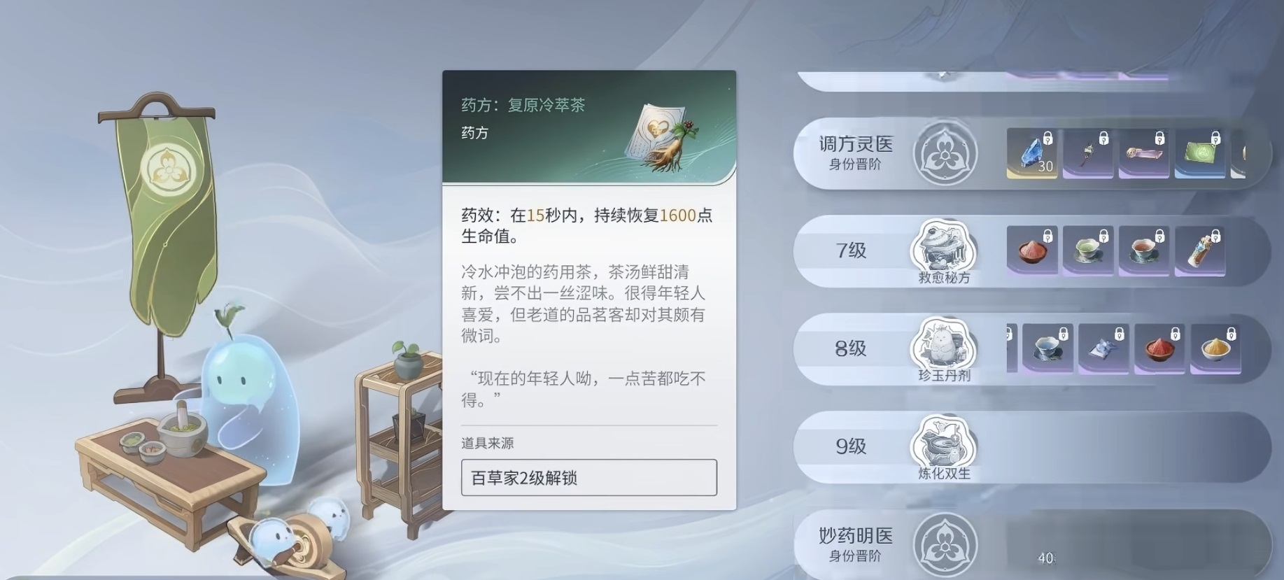百草家职业需通过主线任务自动解锁——玩家推进至指定章节后,与城镇中特定NPC交互即可激活该分支。初始阶段仅开放基础回血药剂制作,随职业等级提升逐步解锁进阶配方,包括瞬时恢复生命值、降低所受伤害等战术型药品。制药经验通过反复炼制积累,高级配方则可通过完成主线/支线任务、开启宝箱、探索秘境或向城镇商人购买获得。
