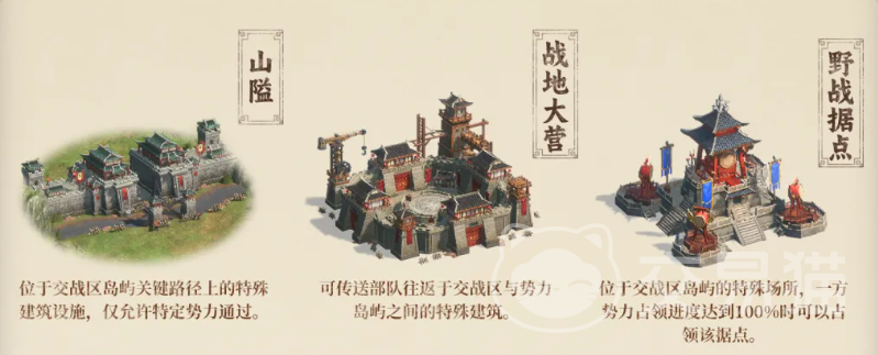交战区内设有战地大营,该设施为连接势力岛屿与前线战场的核心枢纽。玩家可通过战地大营实现部队跨岛调度:既可将后方集结的兵力快速投送至交战区,亦能将前线作战单位有序撤回原属势力岛屿。每座交战区岛屿均部署3座战地大营,构成多点响应的兵力流转网络。