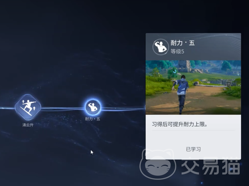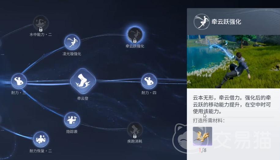 分支路线中,以牵云跃为起点进行规划。首条分支(下方路径)建议点满,可使体力自然恢复速率获得质变级提升,有效缓解持续移动带来的续航压力;第二条分支(上方路径)同样推荐点满,重点强化滞空稳定性与时长,显著提升跨地形跳跃精度与空中转向灵活性。其余分支可根据个人操作习惯或特定地图偏好选择性补足,无强制顺序要求。
