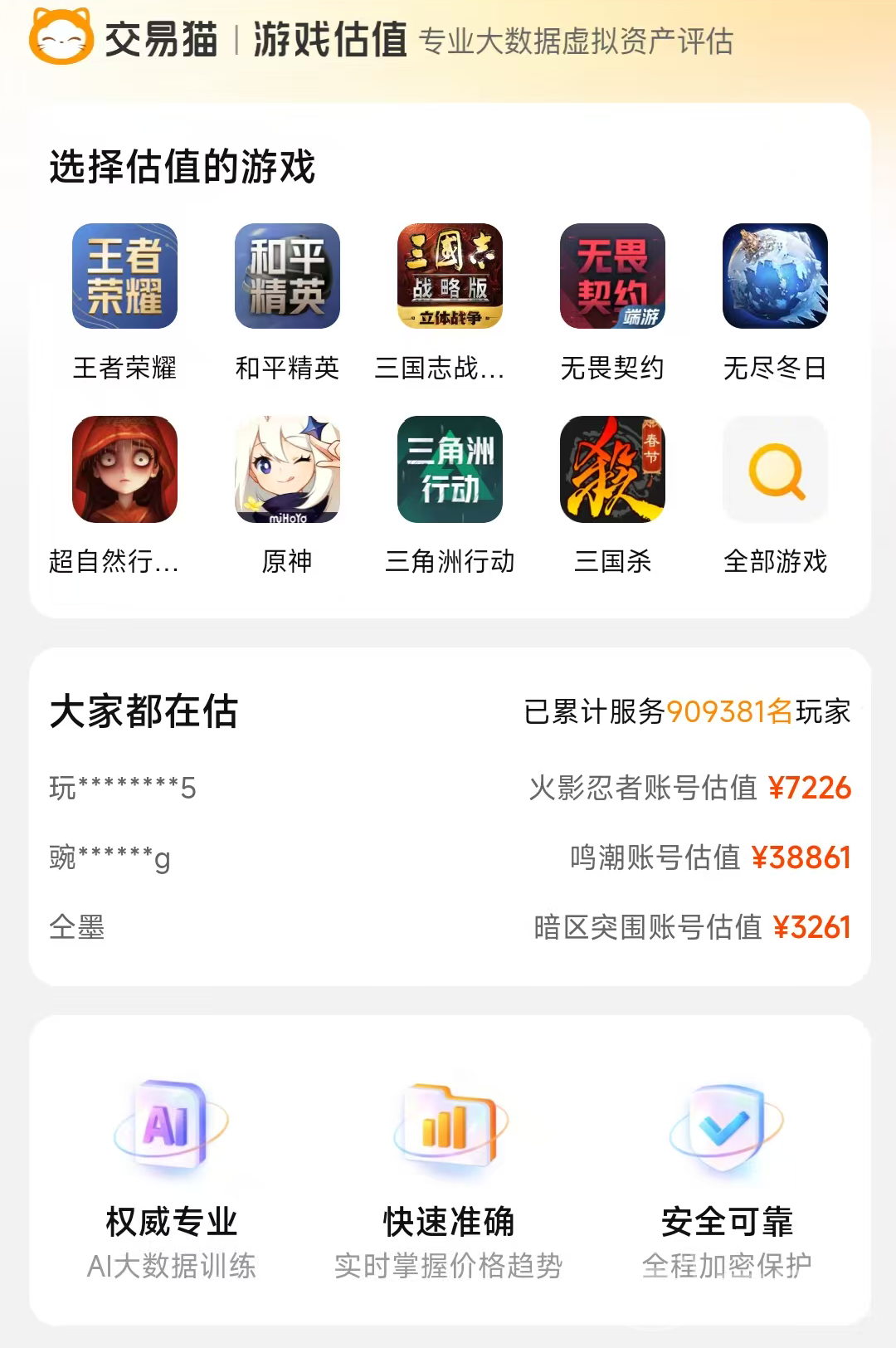 很多玩家在出售账号的时候,肯定是对于账号的价值是不太了解的,怕自己出售太贵导致没有购买的,那么就可以使用交易猫平台的估价功能,这边的估价功能是由专业ai进行分析的,基本上能估算出较为准确的价格,后续放到交易猫平台都是能快速出售的,同时交易猫作为阿里巴巴灵犀互娱旗下平台,有强大阿里背书,安全方面十分有保障,更是业内唯一全场赠送永久包赔服务的平台,安卓用户点击页面上方按钮即可下载,iOS用户访问交易猫官网就能直接使用。