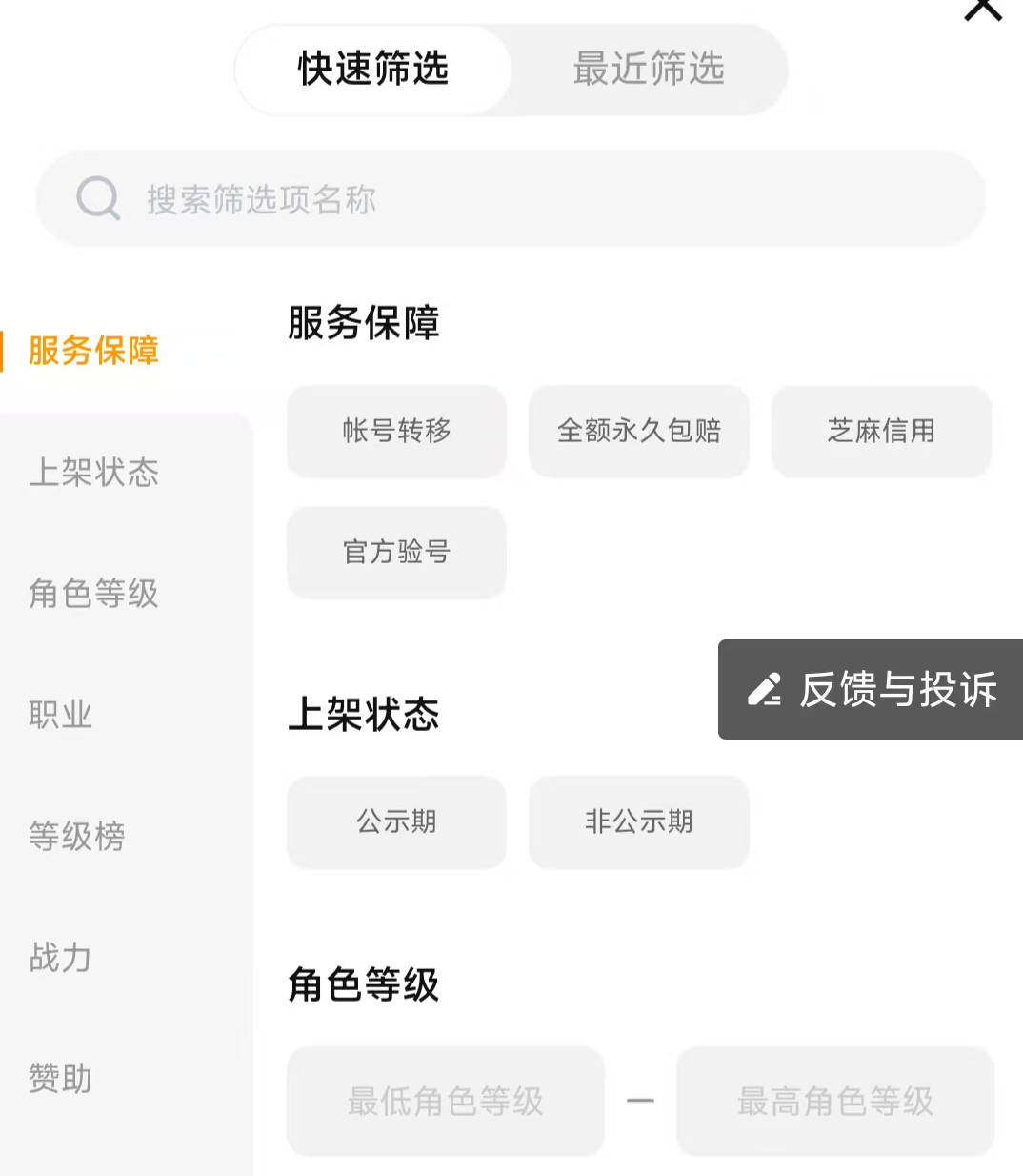 有一部分玩家是比较喜欢高战力的账号,对于其他方面的需求几乎是没有的,但是在挑选的过程中感觉还是有些费时间的,那么就可以打开快速筛选功能,这个功能里面包含了很多的选项,其中就包含了战力选项,可供玩家们自行查找,提高购买账号的效率。