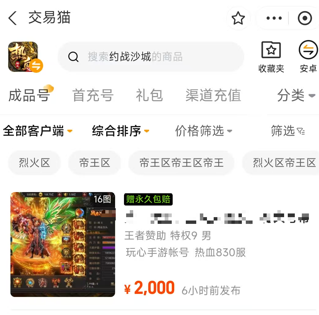 约战沙城是一款类传奇玩法的游戏,游戏内的装备大多依靠打怪掉落,装备成型后刷图效率会变得极高。,所以一部分玩家就想要购买这样高级的成品号,自然约战沙城账号出售平台有哪些成为了关注的重点,而交易猫已经成为最安全的交易平台,其平台内账号数量不仅多,而且交易过程非常安全。