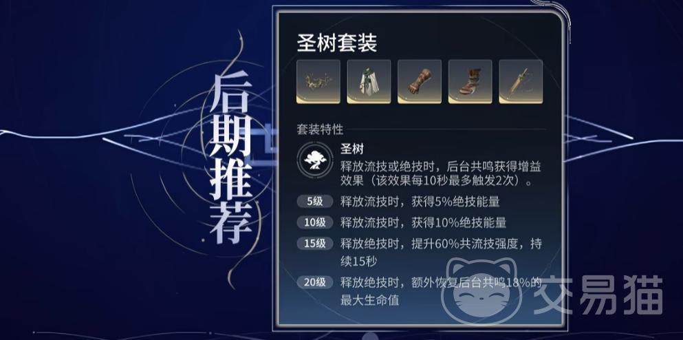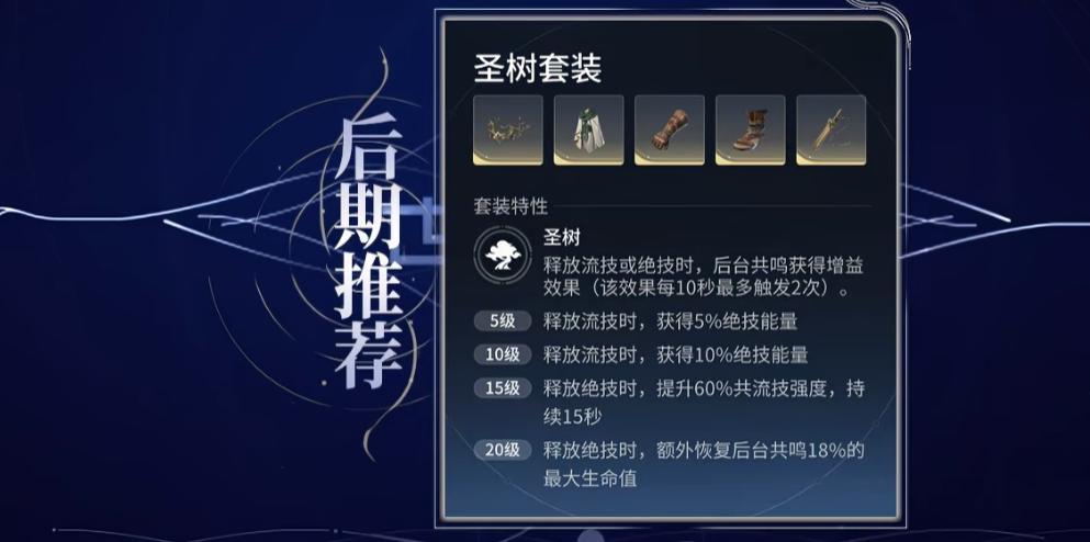 前期推荐选用“魅影套”,优先提升治疗强度与大招充能效率,保障辅助功能稳定性;中后期切换至“圣树套”,该套装在孙膑释放大招时,可为后台待命共鸣角色提供额外绝技能量与生命值增益,深度契合其能量传导机制,进一步放大团队协同效能。