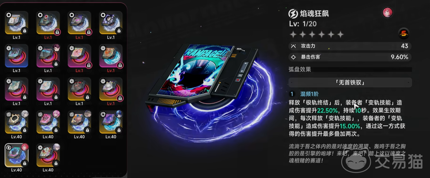 焰魂狂飙弧盘面向极致瞬时爆发需求,属爆发型角色毕业向选择。装备者完成极轨终结后,“变轨技能”释放频率由每秒3次提升至每秒4次;且每次施放均使该技能伤害提升25%,总计可叠加10%额外伤害增幅。该弧盘将技能密度与单次威力双重强化,是速杀精英怪与应对短周期高压阶段的核心配置。