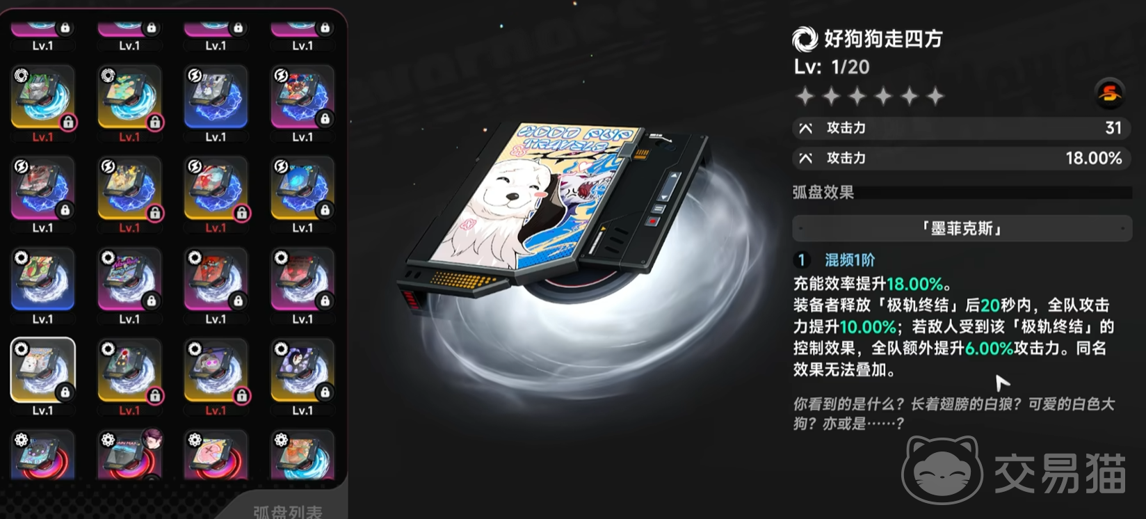 好狗狗走四方弧盘侧重团队协同作战效能。当装备者成功释放“极轨终结”技能后,全队将在20秒内获得10%攻击力加成;与此同时,敌人所受全部伤害均按当前全队攻击力数值计算。该效果在BOSS战与多阶段副本中尤为关键,配合具备强制控制能力的角色(如缄默、艾琳)可稳定延长增益持续时间,显著拉升队伍整体爆发阈值。