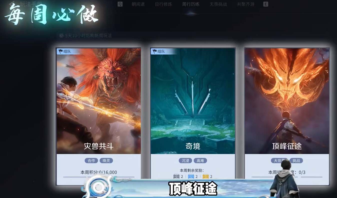 周常任务直接影响中长期成长效率。三大核心组队副本——【灾兽共斗】【奇境】【顶峰征途】,必须确保每周刷满限定次数。这三类副本是英雄升级材料与召唤兽培养材料的最主要产出渠道,难度适中但奖励丰厚,是战力持续提升的关键保障。