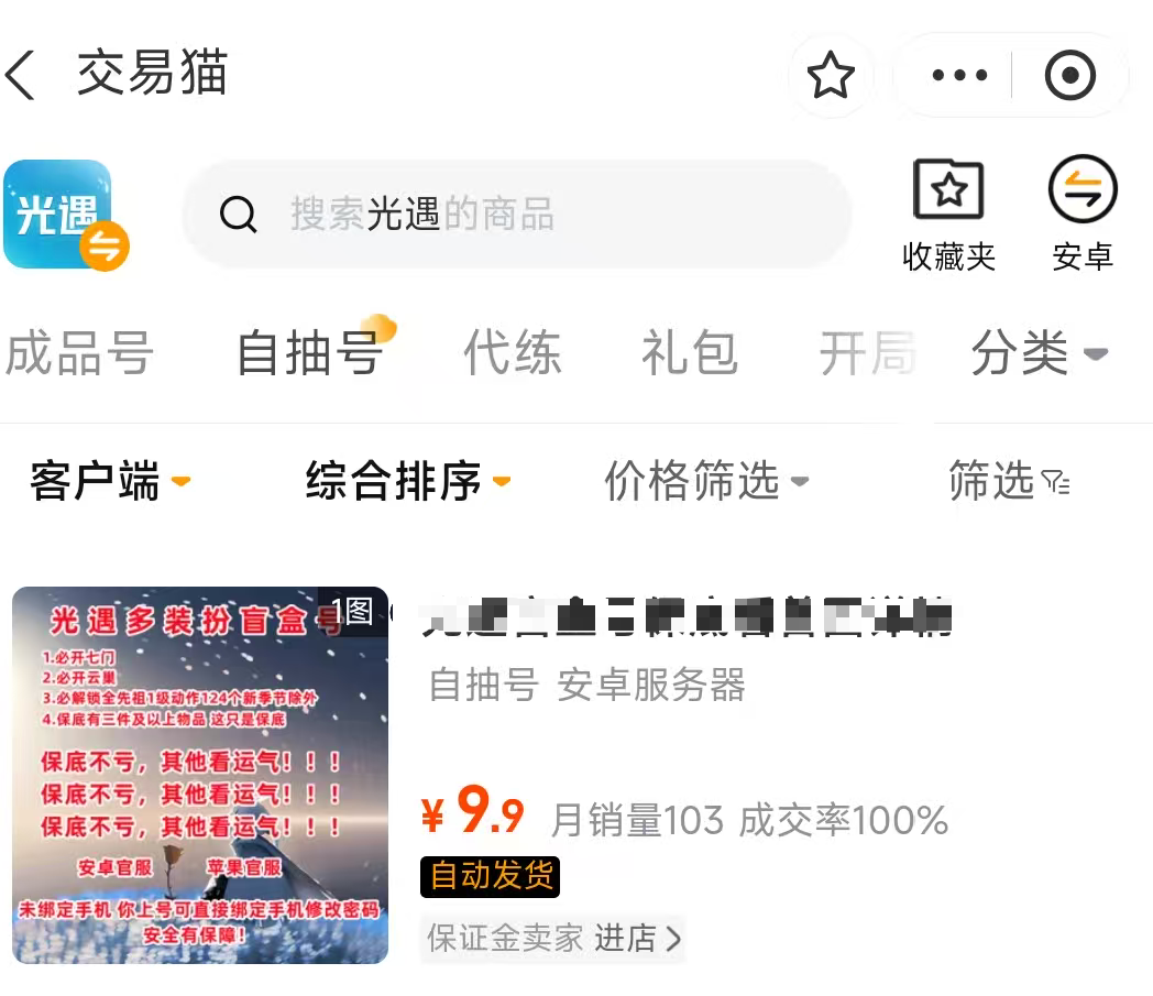 交易猫平台还是提供自抽号出售的,这类账号主要就是出售光遇的盲盒,有很大概率是能抽取好东西的,而且定价方面也比较便宜,如果玩家们手上有这样资源的话,也是可以到交易猫平台进行出售的,其出售流程正规的。