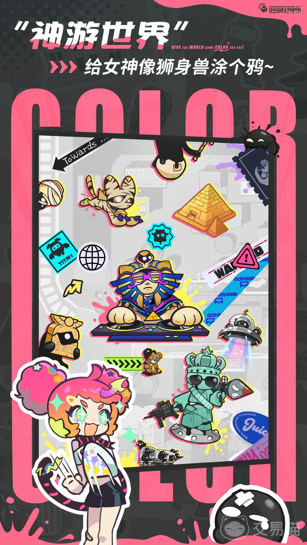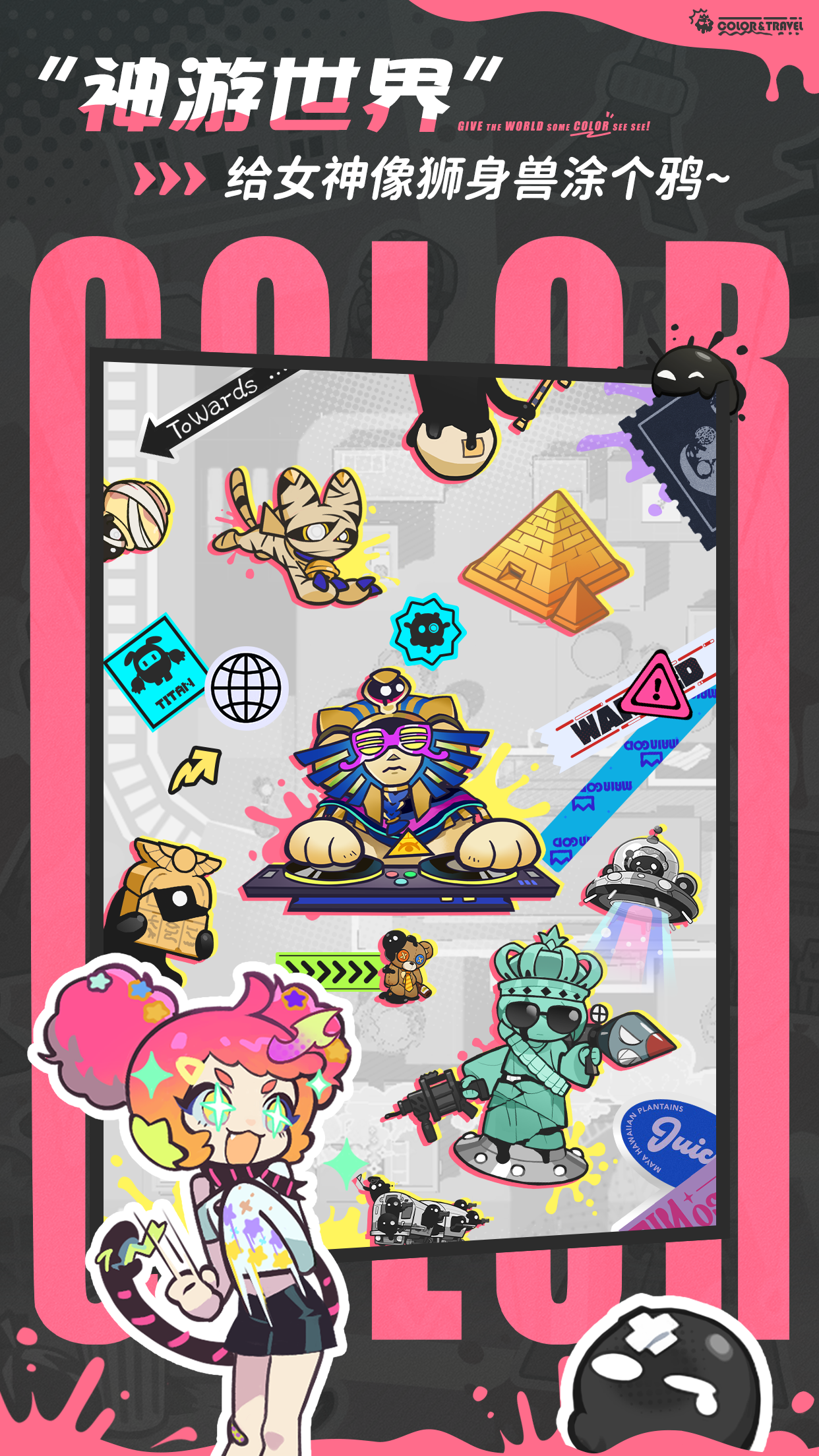 关卡设计贯穿全球地标主题,融合解构式幽默交互逻辑。例如在自由女神像区域激活“导弹喷漆”机制,使雕像手臂发射彩虹轨迹;于埃及金字塔内部与木乃伊NPC协作触发夜光壁画机关,将地宫转化为荧光涂鸦工坊;更可驾驶骆驼加特林、印钞压路机等荒诞载具穿梭场景,在反差感中强化趣味叙事。