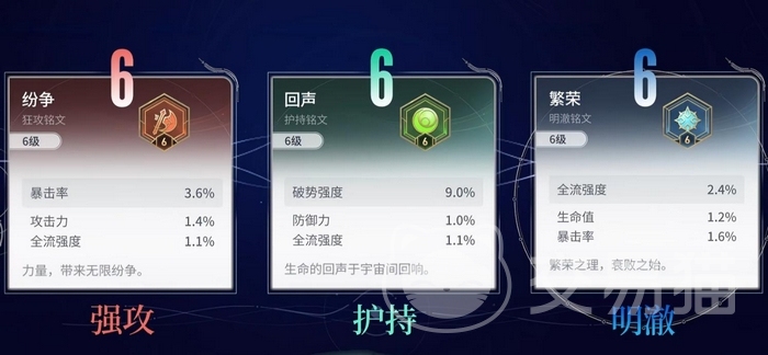 推荐组合为6纷争+6回声+6繁荣。尽管职业标签为辅助,但实战中承担实质输出任务,铭文应侧重伤害构建:纷争提供暴击率、基础攻击力与流技强度;回声与繁荣共同强化全流技强度,并附带破势属性加成,进一步放大技能伤害转化效率。