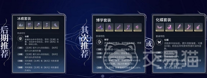 鉴于其输出导向定位,前期推荐选用斗士套装,优先提升攻击力、暴击率与流技强度,加快属性成型速度;中后期可切换为冰痕套,该套装在普攻或流技命中目标后分别触发不同增益效果,当两种效果同时存在时,还将额外获得高额伤害增幅。博学套与合化蝶套亦具备良好适配性,可根据战局灵活选择。