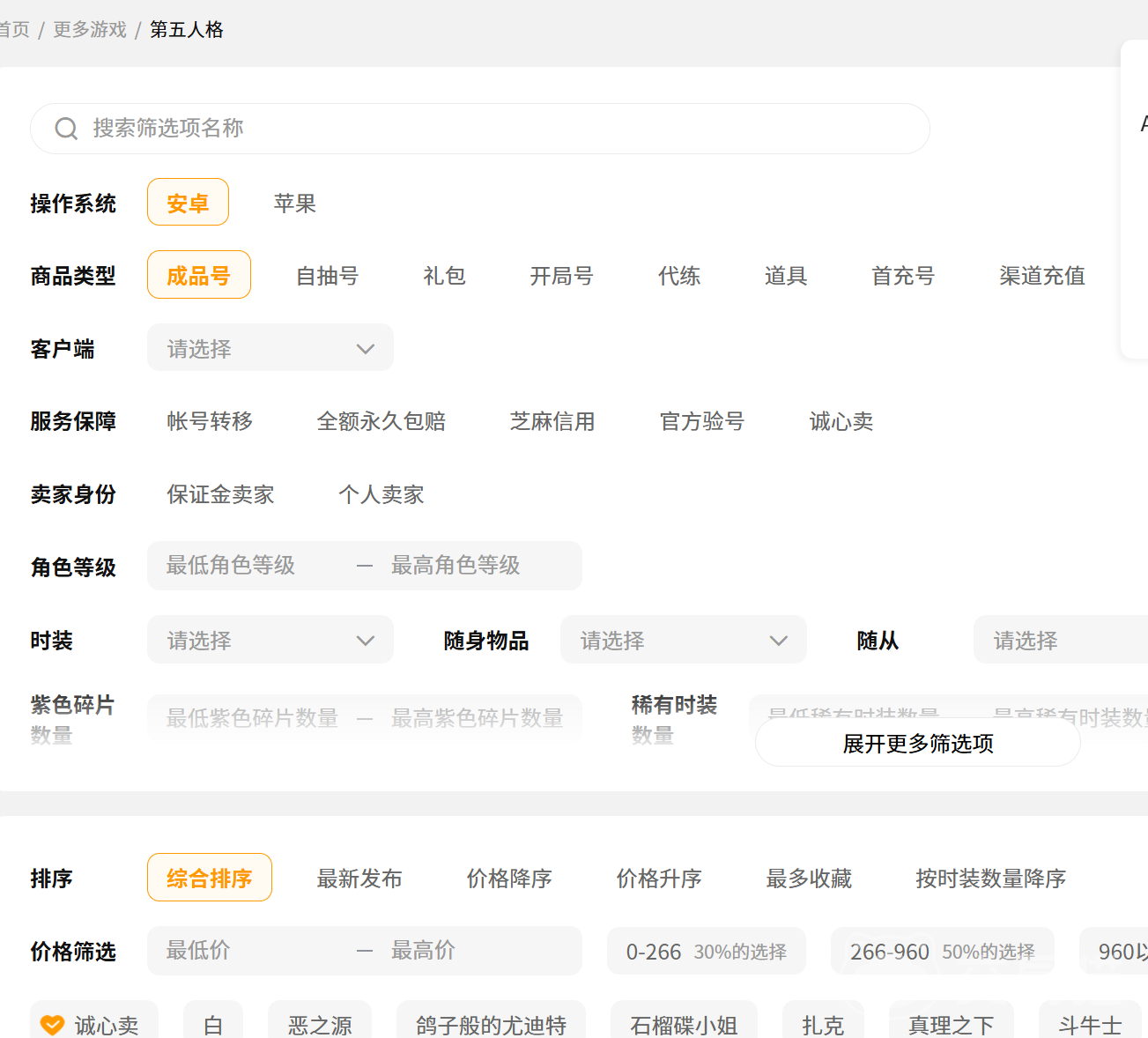 平台支持官服及主流渠道服(如华为、小米、OPPO等)账号交易,覆盖从零起步的新手初始号、线索资源充沛的紫薯养成号、拥有“红蝶·夜莺”“约里克·暗影之子”等高人气限定皮肤的满配成品号,到段位达噩梦Ⅲ以上、全角色精通且天赋加点完备的高阶实战号。筛选功能高度细化,支持按皮肤组合(如“红夫人+杰克联动套装”)、价格区间、段位等级、是否含实名认证等多维度精准过滤,大幅提升目标账号匹配效率。