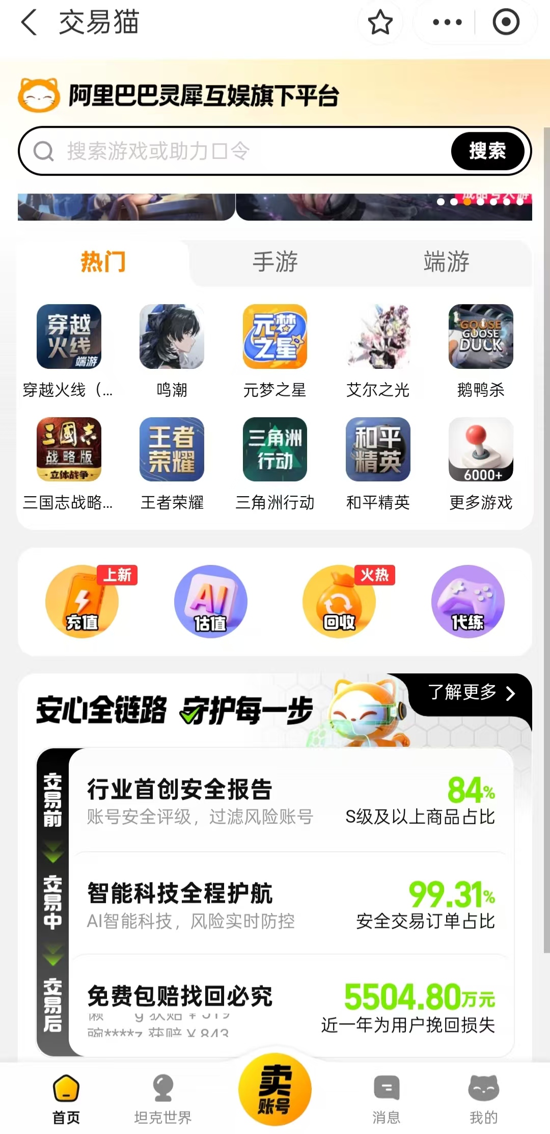 安卓用户可直接通过上方链接完成安装;iOS用户得在浏览器里访问交易猫官网。作为一家覆盖游戏全面的平台,它已接入了6000多款主流游戏,上架的虚拟商品超过100多万,累计服务玩家数超7000万。而且平台是阿里巴巴灵犀互娱旗下的,依托大厂背景,安全有保障,可以放心用。上架的商品都会经过平台严格审核,官方验号服务已覆盖了百余款热门游戏,坦克世界也在其中,这样买家使用起来会更安心,卖家进行账号交易也更省心。