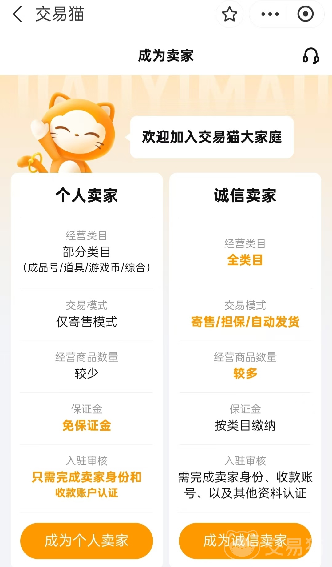 平台支持个人卖家和诚信商家两种卖家身份,个人卖家不用缴纳保证金,只要开通寄售功能即可,审核流程简单,适合普通玩家临时处理游戏账号;诚信商家得先通过资质审核并缴纳保证金,享有寄售、担保交易与自动发货三种模式,还拥有专属标识,在曝光量和买家信任度上更占优势,特别适合长期从事坦克世界等热门端游账号交易的高频卖家。