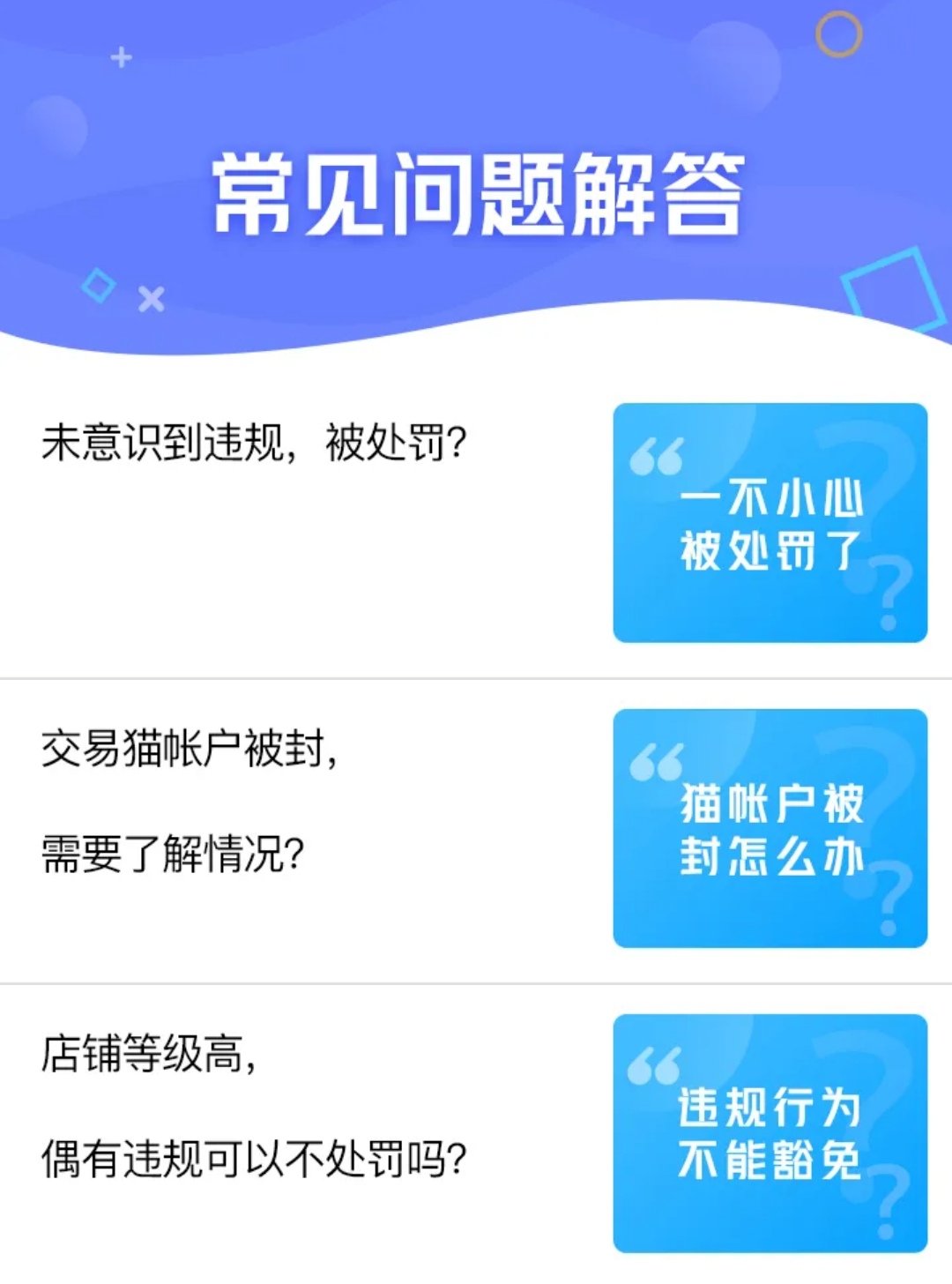 相信在这之前没听说过交易猫的老哥们应该不经常买卖账号,大概也对游戏账号交易过程中的注意事项知之甚少,交易猫专门设置有“常见问题解答”以及案例分析等板块,这里基本上能够解答绝大多数老哥的困惑,各种鲜活的案例也必然能够让大家警醒,增强大家的防范意识。