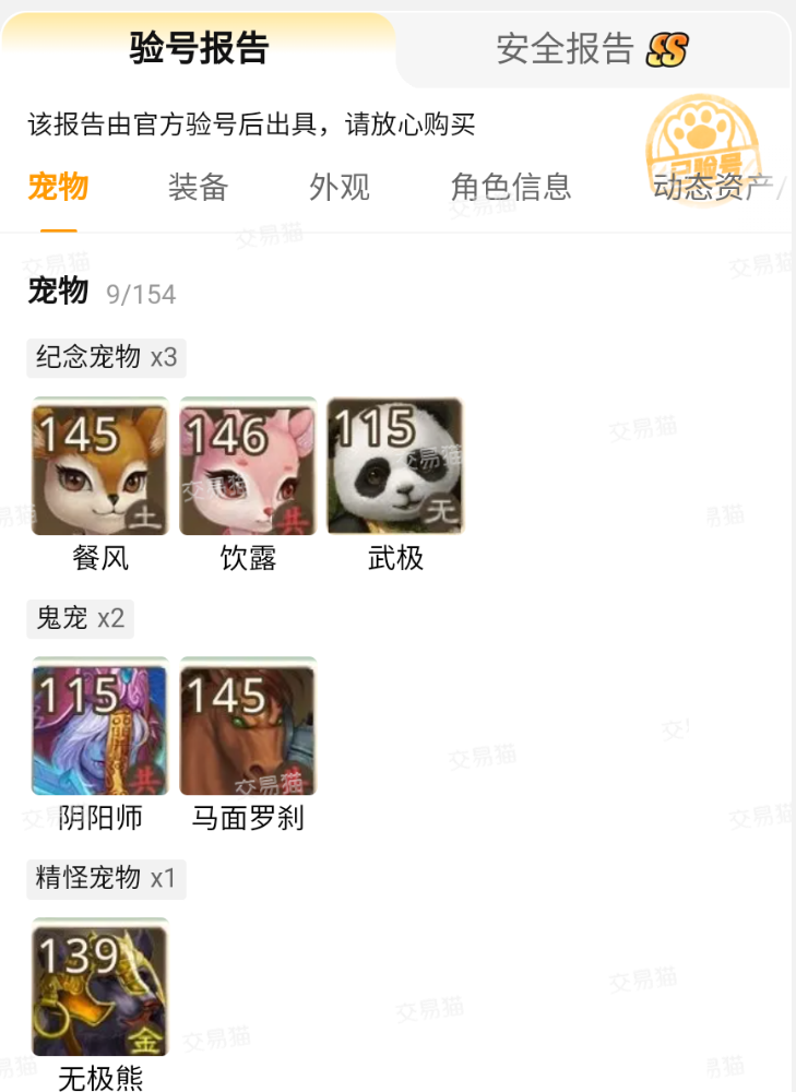 传统平台的验号工作往往需要买家自己上号查证,这种流程不但耗费时间而且查验结果未必能面面俱到。交易猫平台为诸如问道这类热门游戏提供了官方验号功能,卖家在上架账号时只要选择该功能就能实现官方全自动的验号服务,并能够在商品页面以验号报告的形式展示出来。从下图中不难看出,官方的验号报告非常详尽,可以说是全方位体现了账号的价值。