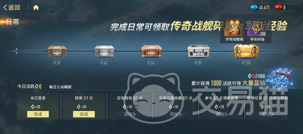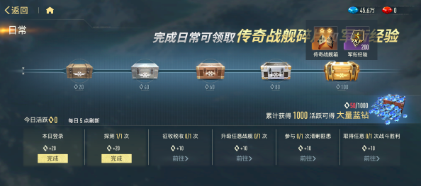 第四类日常化入口为活跃度系统。完成每日任务可积累活跃度积分,当日活跃度达到100点后,自动解锁「战舰碎片宝箱」一个。该宝箱每日可领取一次,内含多档碎片奖励,涵盖多个传奇舰种,同时附带军衔经验,助力角色等级成长。