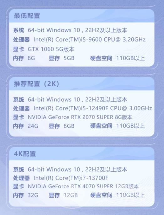 PC版本对硬件的要求更为突出:安装包体积达110GB,接近主流3A级单机大作规模,这源于其高精度角色建模、写实级场景渲染、电影化过场演出及复杂粒子特效系统。运行内存方面,最低配置需8GB,推荐配置提升至24GB;若追求4K分辨率下的极致画质与帧率稳定性,则建议配备32GB系统内存。