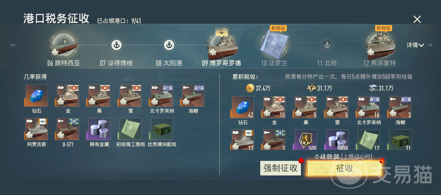 港口税务征收是长期资源供给的关键模块。随着游戏时间推移及已占领港口数量增加,税收系统将持续产出战舰碎片及基础物资,构成远洋作战与舰队升级的稳定后勤支撑,建议每日定时收取,不可遗漏。