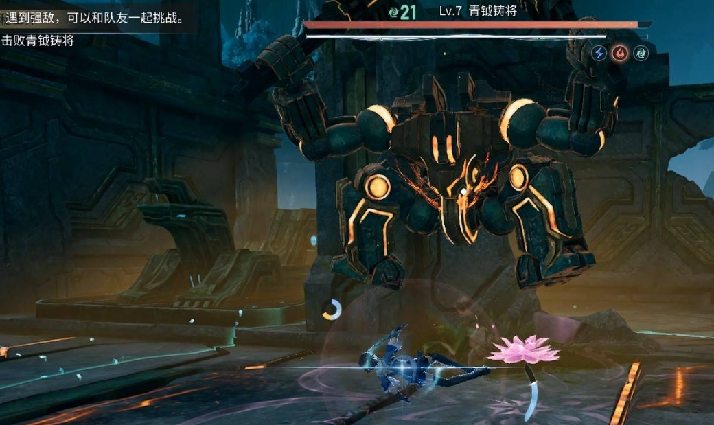 最终阶段,青钺铸将召唤两道巨型黄色武器虚影投掷而出,轨迹清晰、移动缓慢,易于预判躲避;但需警惕其回收动作——武器回撤路径存在短暂延迟判定区,切勿停留于投掷轴线正后方。待所有技能循环结束,即可集中火力完成收尾输出。