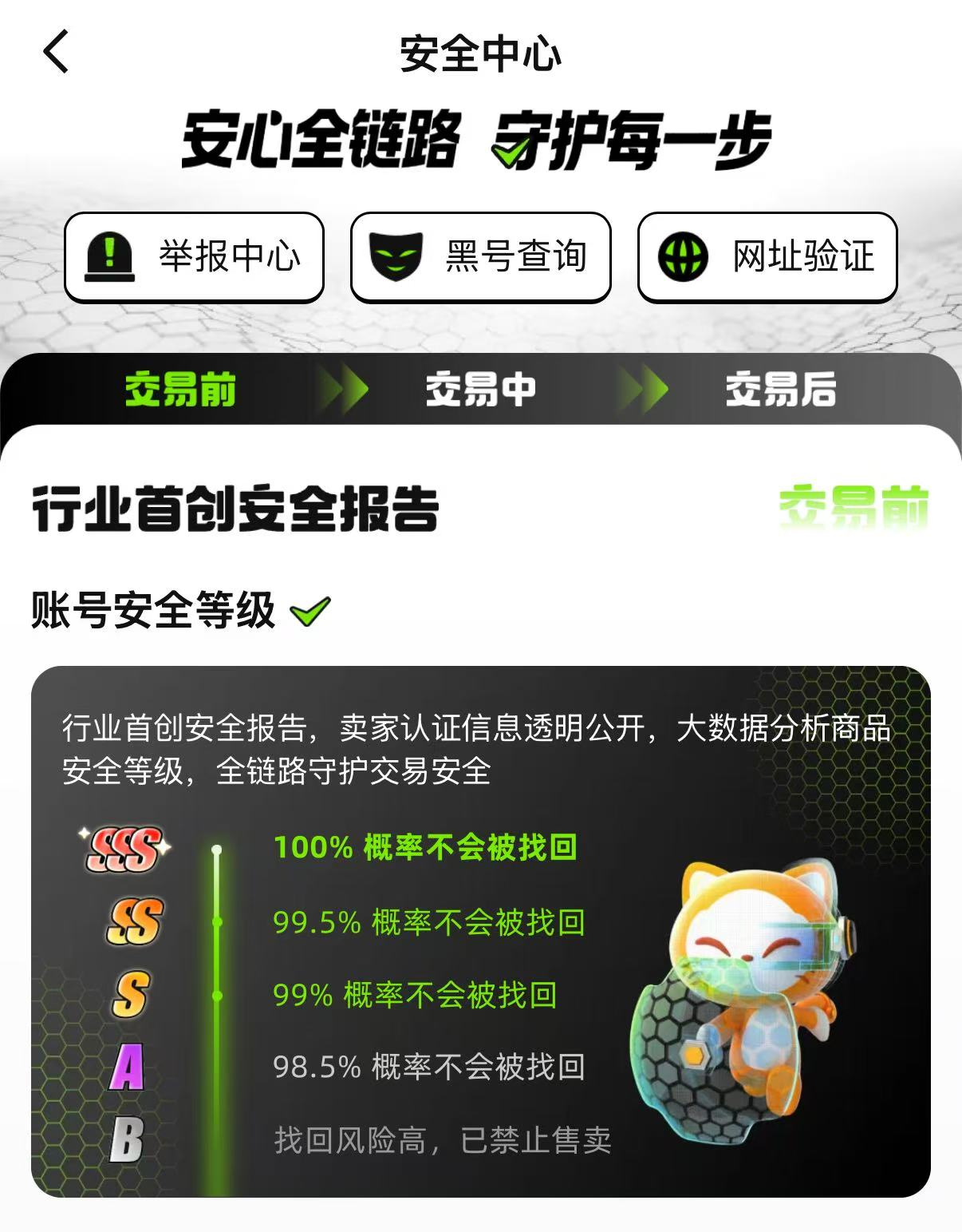 选号的时候还可以在安全中心里进行黑号验证和网址验证,发现黑号或者钓鱼链接直接在举报中心进行举报。安全中心里详细介绍平台从交易前到交易后各种安全防护,严格保护大家交易的每一道程序。
