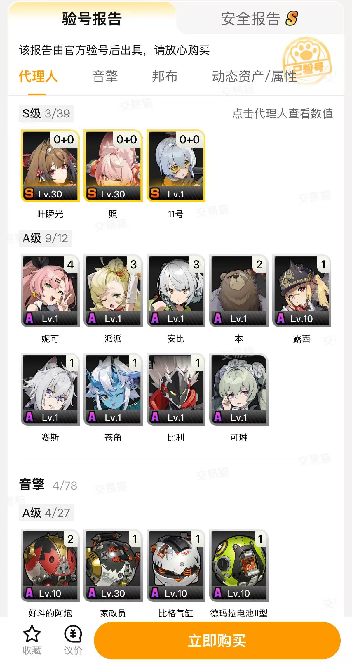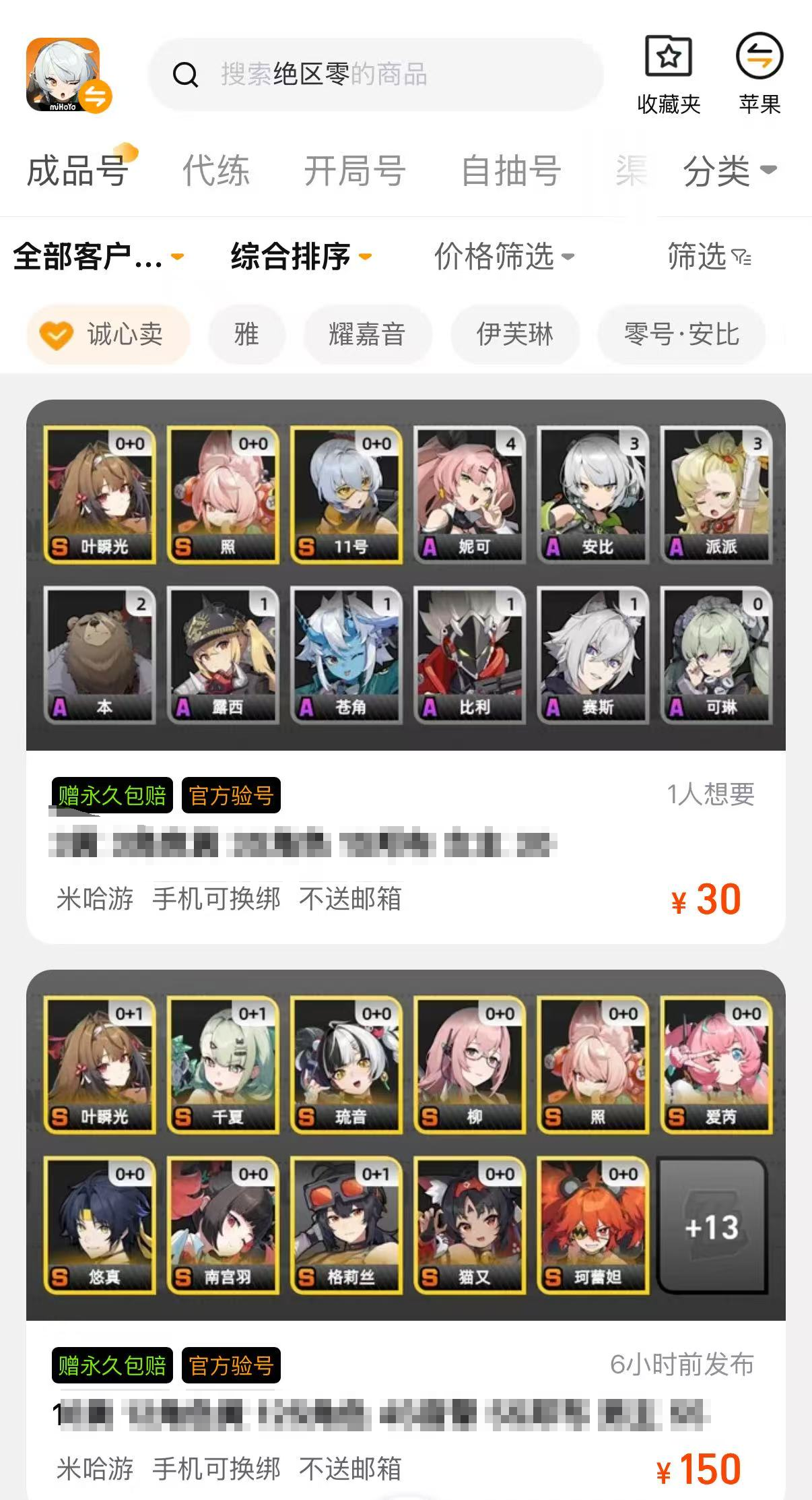 平台拥有海量的绝区零游戏账号资源,从新手号、自抽号到满命毕业号应有尽有,这些账号的价格都是明码标价的,便宜的账号只要几十元,对账号细节品质要求更高的也能买到上千元的优质账号,满足不同玩家的需求。平台AI风控会先帮大家筛查黑号,将黑号都挡在门外,系统推荐和显示的都是来源可靠的账号。