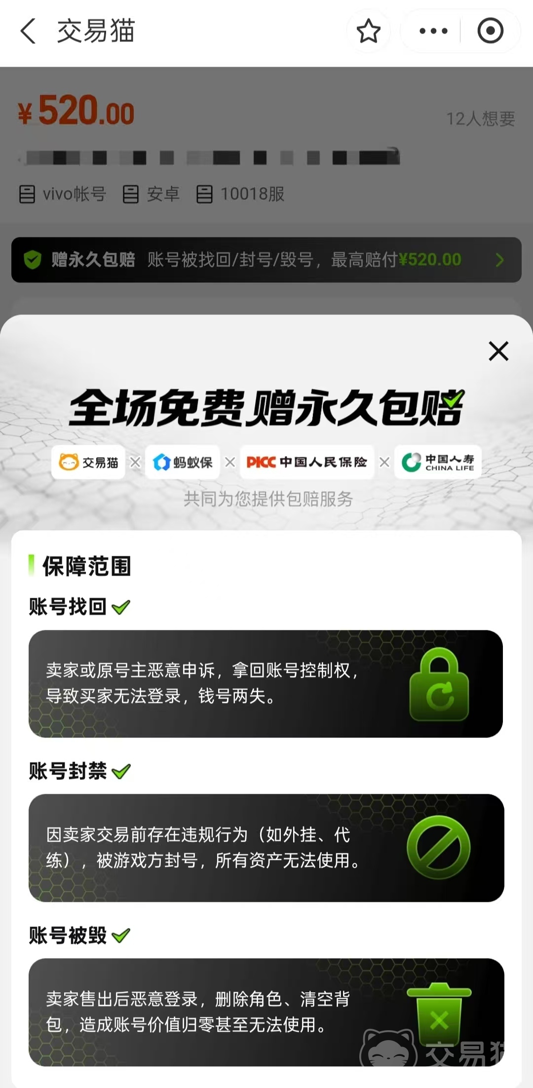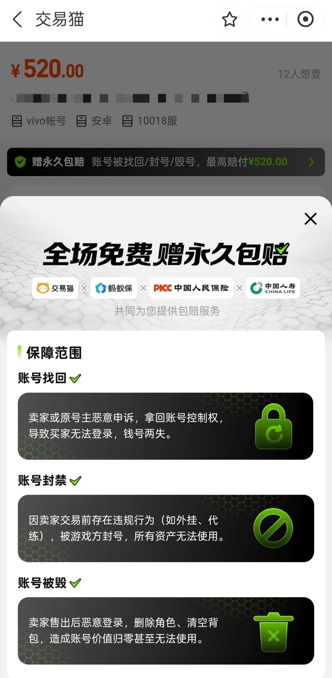然而,一些用户依然对购买账号后可能出现的账号被原主人找回、账号被盗等问题表示担忧,实际上,这种担心是没有必要的。作为业内唯一一家全程提供“永久包赔”服务的平台,若是用户在账号交易中出现任何问题,平台会依据相关规定给买家进行资金赔付,从而可以切实保障买家的合法权益,让其完全不用担心购买账号后可能出现的纠纷或意外情况。
