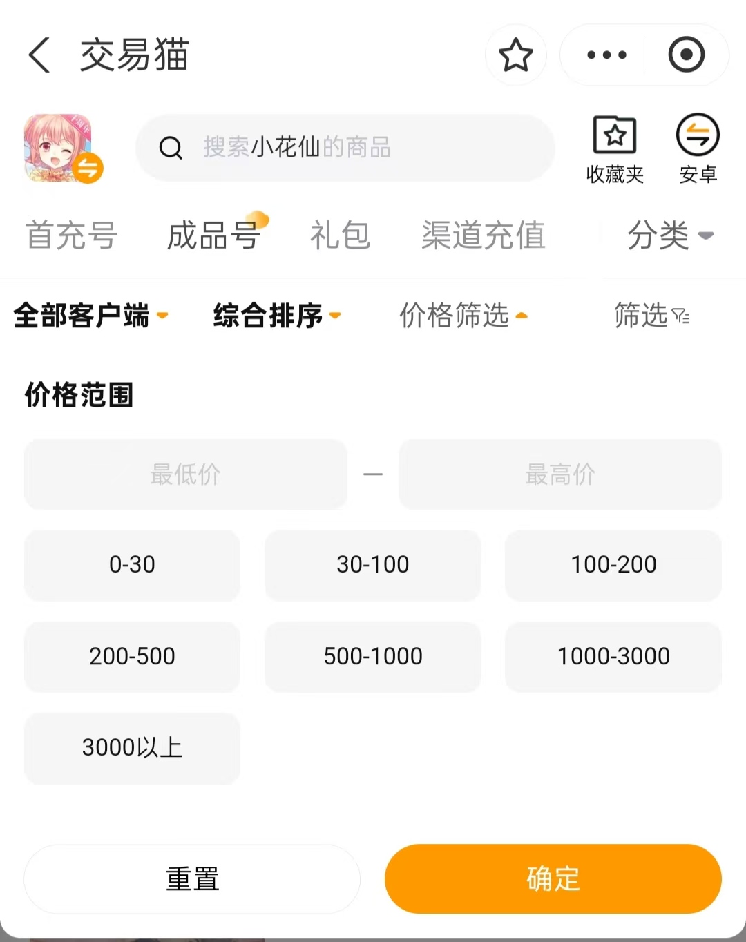 在交易猫平台购买小花仙账号,还不需要盲目搜索,平台的精准筛选功能可以帮助用户快速锁定想要的。它还支持按不同价格区间进行筛选,比如预算不多的用户,可以直接选符合自己预算的范围,以便快速找到符合预期的账号,不用在一堆不相关的信息中浪费时间。