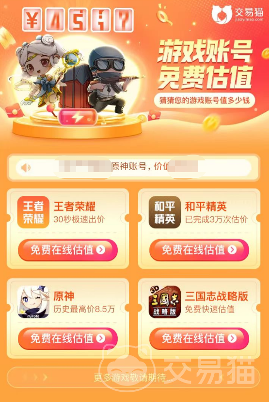 不管你是想给闲置游戏账号估值,还是想顺利的卖掉账号,交易猫这个账号估值平台都能满足相应的需求,让玩家轻松搞定账号估值和出售,再也不用为账号定价发愁。