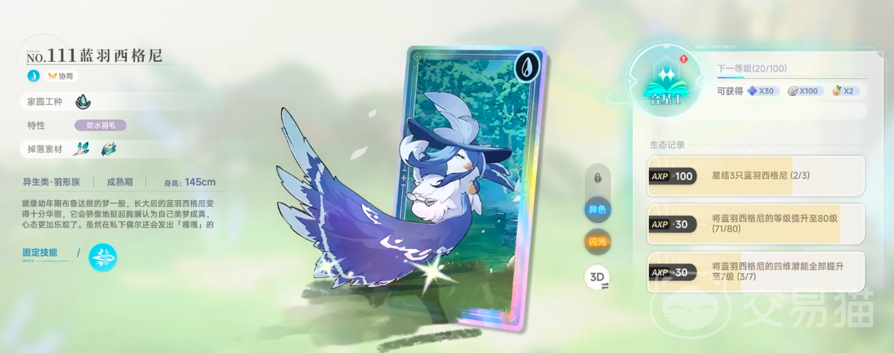 完成合星进化后,布鲁达将蜕变为成熟体蓝羽西格尼,仍属异生类羽形族奇波。体型由幼态40cm显著增长至145cm,核心技能“水炮攻击”伤害提升30%,飞行稳定性增强,可稳定执行空中打击战术。该形态满级上限为100级,战斗中可掉落蓝色羽毛素材。在编队策略上,推荐搭配末音、阿比等协同型角色,以强化队伍整体输出与机动性表现。